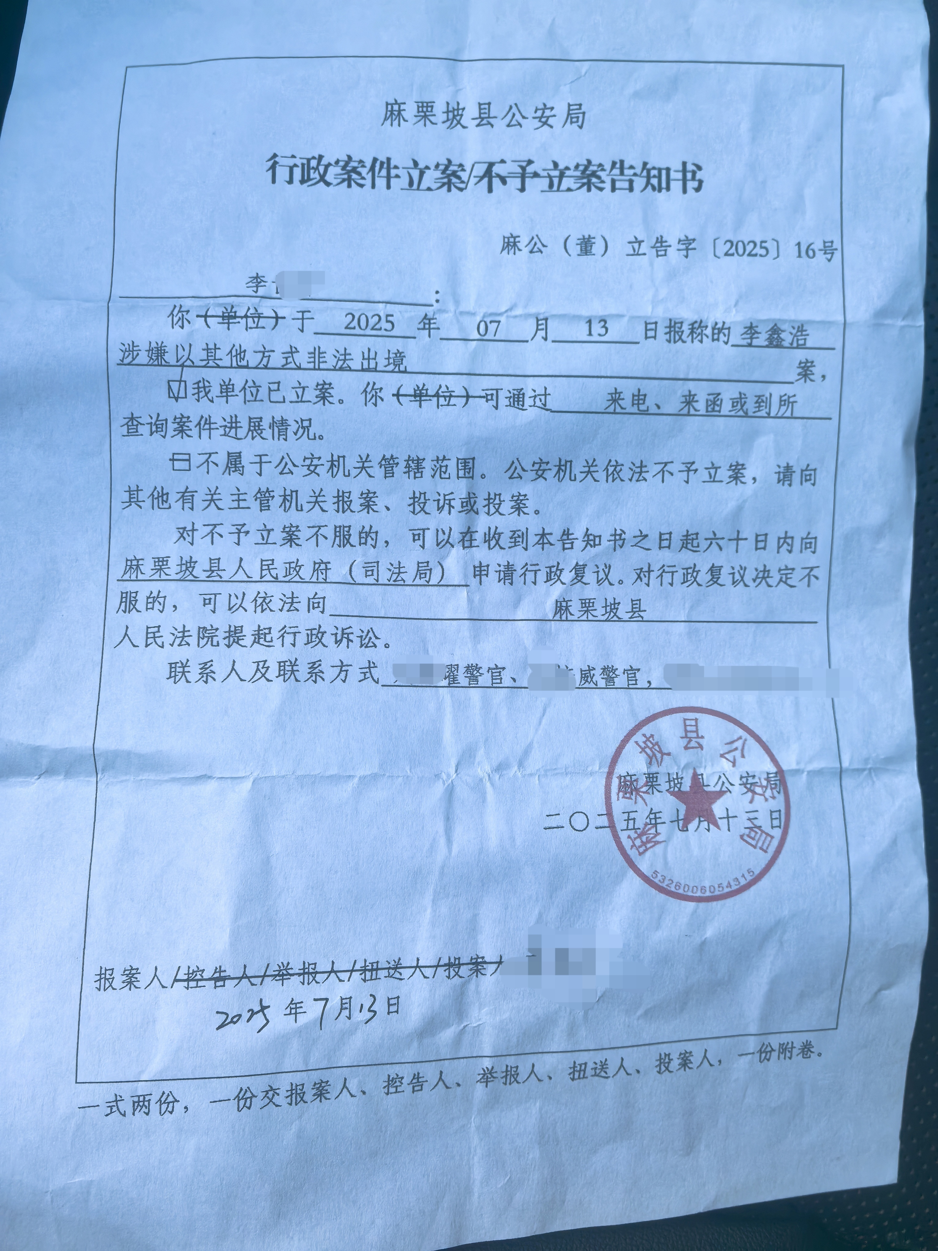 据李先生提供的报案回执显示,他于7月13日向麻栗坡县公安局报称的“李鑫浩涉嫌以其他方式非法出境案”,麻栗坡县公安局已立案。
